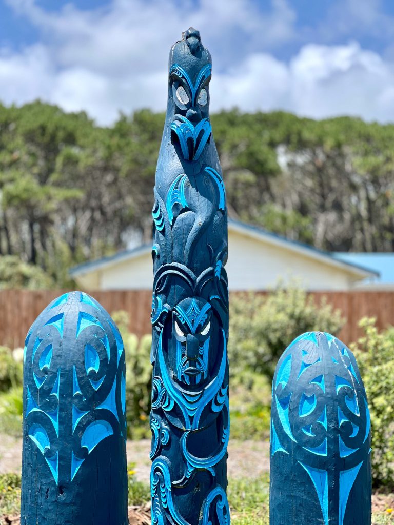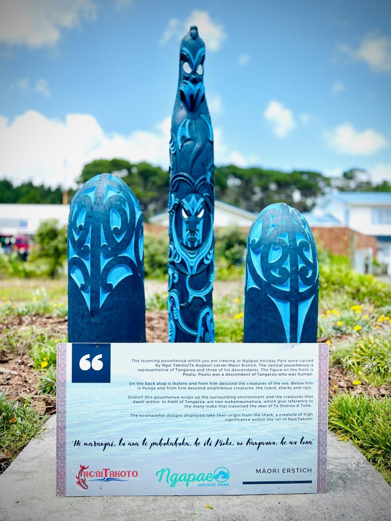 Ngāpae Holiday Park have beautiful pouwhenua standing at the entrance of our site carved by Māori Erstich. The central pou is representative of Tangaroa and three of his descendants. The figure on the front is Poutu, a descendent of Tangaroa who was human.